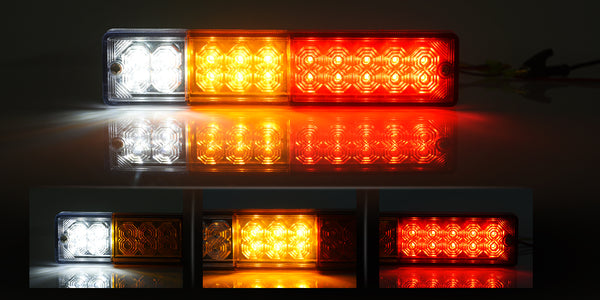 Trailer tail lights with Red, Amber and White beam, and perform multiple functions, includes rear lamp, running light, brake light, turn signal light, reverse lamp, etc. They are bright enough to catch the attention of those following the trailer.