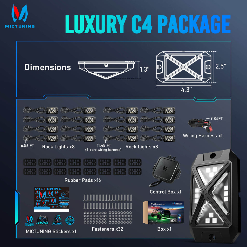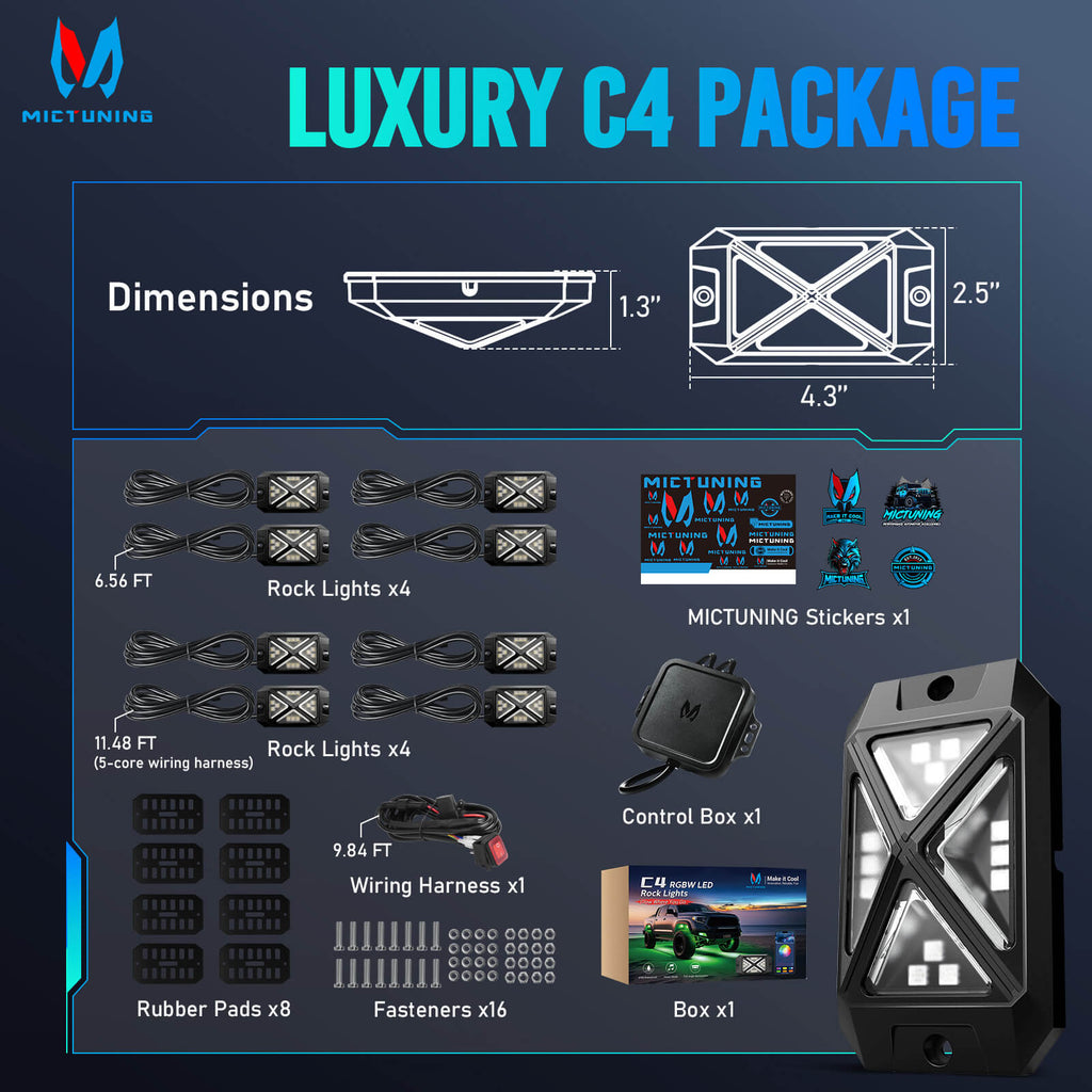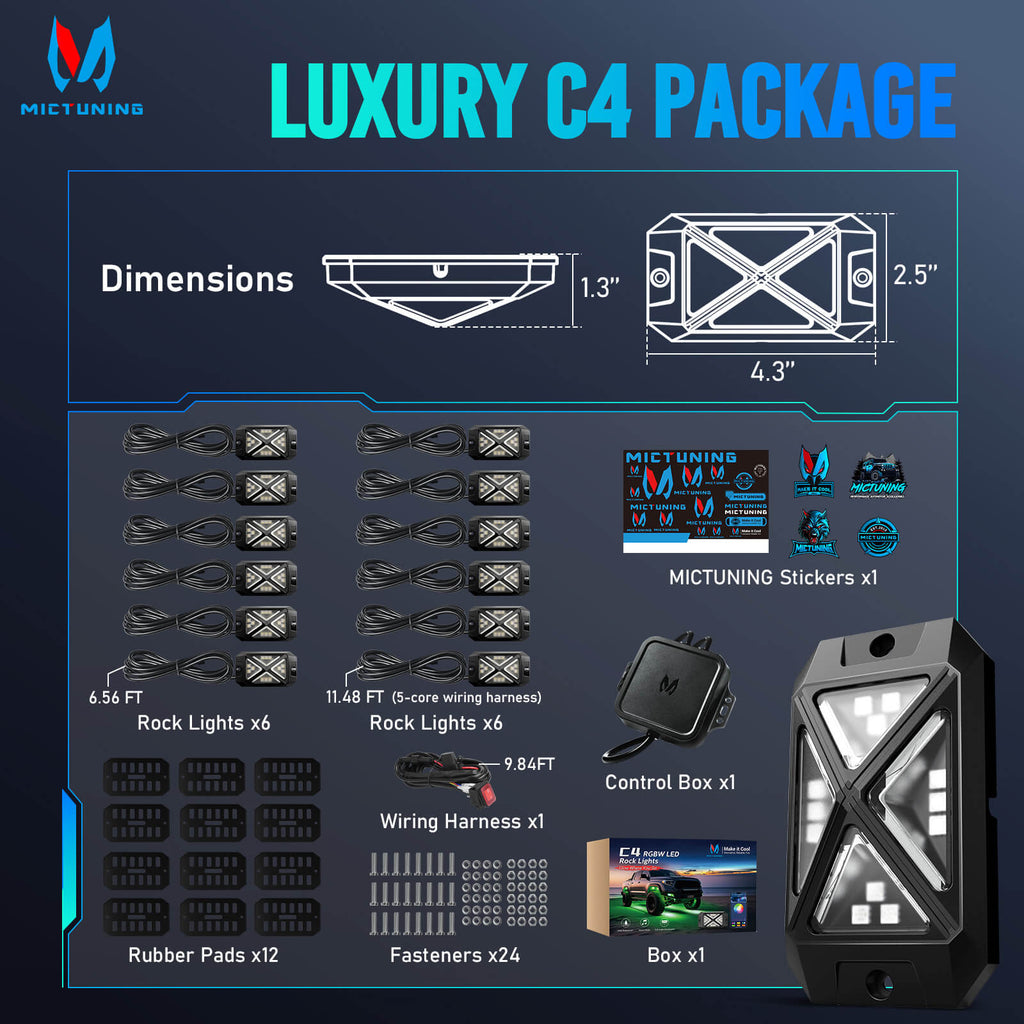 Meet the MICTUNING C4 RGBW Rock Light Kit—designed to turn heads wherever you go! With 360° vibrant lighting, pure white and vivid RGBW colors, and double the beam spread of standard rock lights, your vehicle will stand out on trails, streets, or at the next car meet. Control everything easily through the MICTUNING App—sync to music, create custom patterns, and set the perfect vibe. Plus, it’s IP68 waterproof and built to handle any terrain or weather.