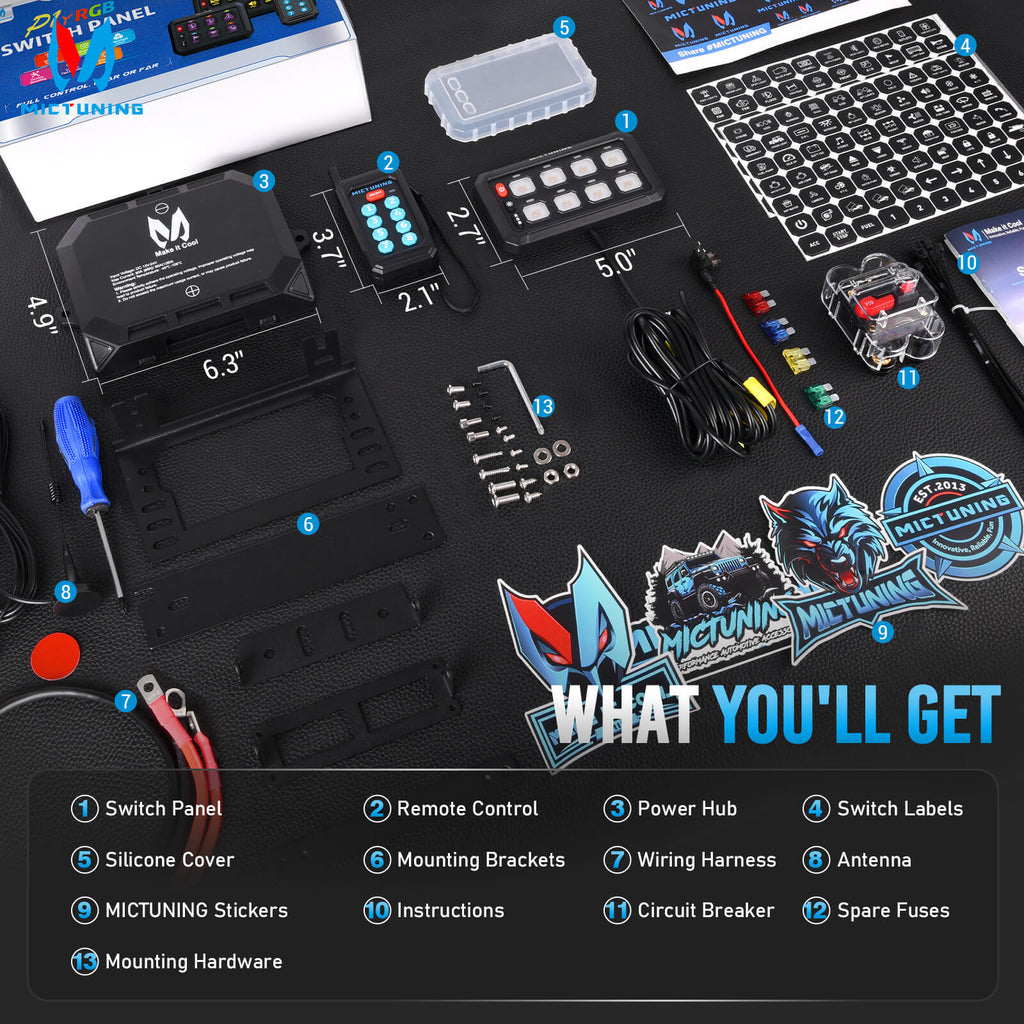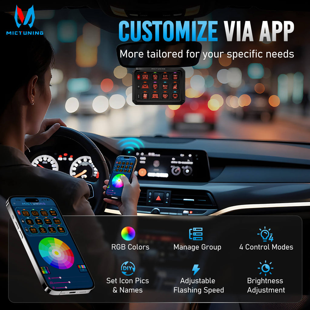 • Customization via App – Personalize your setup with the MICTUNING app. Choose from multiple backlight colors, group and control multiple switches, adjust flash speed, and even assign custom images or names to each switch (APP Control Distance: Up to 50 FT under ideal condition)