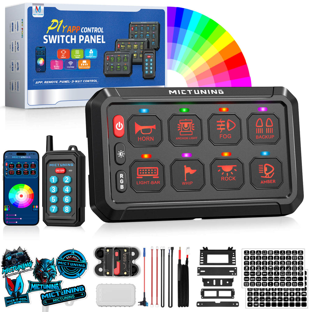 Take command with the MICTUNING P1Y RGB Switch Panel — control your lights from the panel, app, or up to 230ft away with the remote. Choose from 4 modes, adjust brightness, and enjoy advanced remote control for ultimate versatility. Rugged, IP65 waterproof, and built for trucks, boats, and off-road adventures, this panel gives you power, style, and convenience all in one.